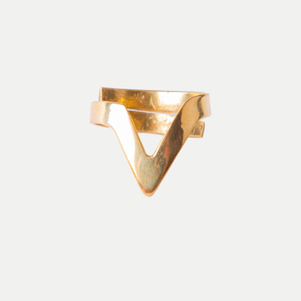 This hand-cast adjustable brass ring has a beautiful chevron shape, giving it a simple edge and a cool angle. It's made of recycled brass and combines a modern trend with ancient metalsmithing skills.