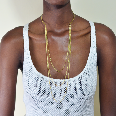 This versatile piece can be styled in several ways to match your look - open towards the front with the chain hanging long, or open towards the back. We're still discovering new ways to wear it!